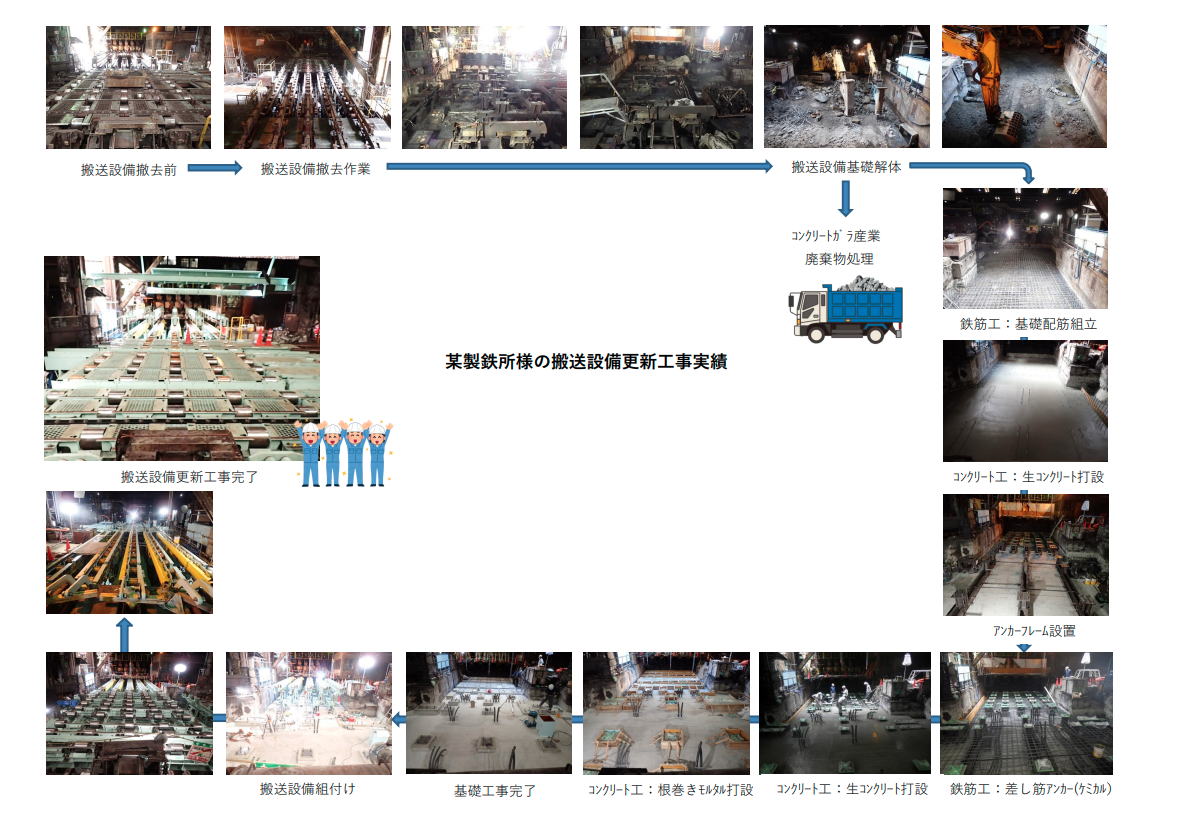 生成物検査台車配線工事機械器具設置工事業 熱交換器及びバーナ交換工事 機械器具設置工事業 排出口ライナー交換 機械器具設置工事業 大型破砕機修繕 機械器具設置工事業 ホッパー製作 機械器具設置工事業 膜ろ過装置 自動弁修繕 機械器具設置工事業 ユニット製作 機械器具設置工事業 車両オーブン出口扉補修 機械器具設置工事業 乾燥機ファイナルドライヤー断熱パネル更新工事 他 解体工事業 旧ごみ焼却処理施設上屋解体工事 解体工事業 変電所トランス解体作業 解体工事業 タワーマンション実験棟解体工事 管工事業 消火栓ポンプ更新 管工事業 汚水配管改修工事 管工事業 排水配管更新 管工事業 湯洗槽排気ダクト交換 土木工事業 雨水配管設置工事 とび・土工工事業 PCB保管庫床汚染箇所除去工事 とび・土工工事業 煙突ダイオキシン除染作業 とび・土工工事業 西側トイレ アスベスト除去工事 内装仕上工事業 新規スタジオ鏡設置工事